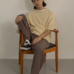 レーヨンの落ち感と麻を全面に出した粗野感、そしてタンブラー加工を施しています。